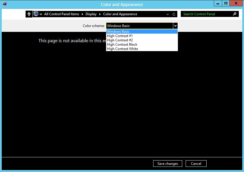 So, you’d think all you need to do is go to the control panel and change the color scheme, right? You’d be wrong. Let’s head there now. Go to Control Panel | Display | Color and Appearance (or Change windows colors). By default, the color scheme is set to Windows Basic and it says “This page is not available in this edition of Windows.” Again, lovely. OK, so there are a few options in the Color scheme drop down menu.